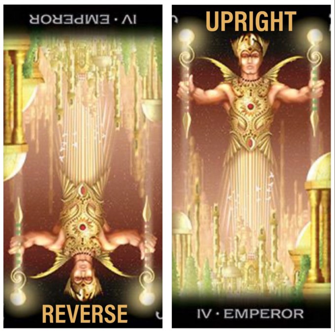 I attached the photo of ‘THE EMPEROR’ to this post to show you what I mean, if you’re not familiar with Tarot. Each card’s energy can be read by the reader either UPRIGHT or in REVERSE.